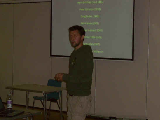 Chris then welcomed Terry Smith back to our meeting, who, after a year of treatment since his accident, is able to speak and remember almost all about his birds and us breeders! Although still in a wheel chair and learning to walk again, it means hes back! Our thanks to his son for bring him to the meeting. Before the introduction of our speaker I said a few words regarding the Wednesday September 11th meeting with Dr Rob Marshall, which will be starting at 7.30. We will also be opening the shutters to enlarge the hall to cater for the additional breeders who may attend. Chris then introduced our speaker for the evening, Andrew Luke, who started with a brief of the evenings presentation: · The bloodlines that our birds are based on · The varieties we keep · Our birdroom and management · Feeding · Our birds from 2001-2008 · The Molkentin stud (setup plus birds)